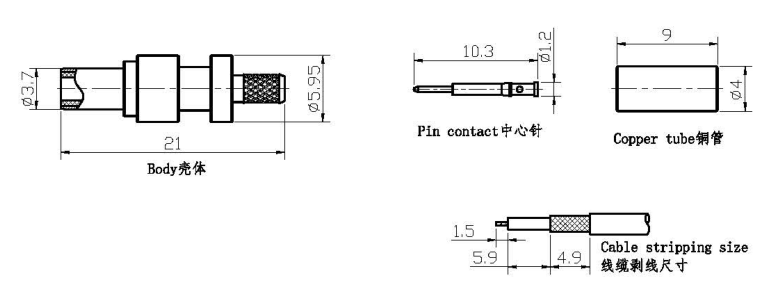 مواد موصل فقرا: الغلاف: نحاس مطلي بالنيكل؛ دبوس المركز: نحاس مطلي بالذهب؛ العازل: PTFE؛ الغلاف الخارجي: PA66+30%GF؛ أنبوب النحاس: نحاس مطلي بالنيكل؛ حلقة التثبيت: PA66+30%GF