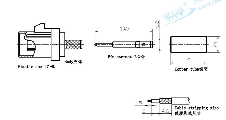 Matériaux du connecteur : Boîtier : laiton nickelé ; Broche centrale : laiton plaqué or ; Isolant : PTFE ; Enveloppe extérieure : PA66+30 %GF ; Tube en cuivre : laiton nickelé