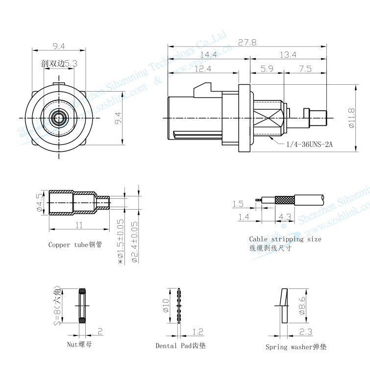 Matériaux du connecteur : Boîtier : alliage ternaire de laiton ; Broche centrale : laiton plaqué or ; Isolant : PTFE ; Enveloppe extérieure : PA66 + 30 % GF ; Tube en cuivre : laiton nickelé ; Joint torique : silicone noir