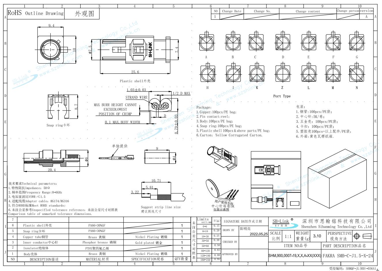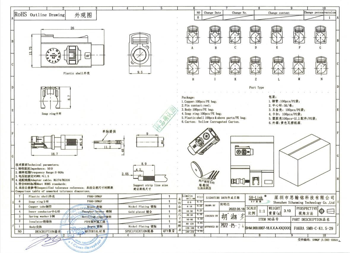 FAKRA csatlakozó anyagai: Ház: PA66 + 30% GF; Csatlakozó: PA66 + 30% GF; Rézcső: Nikkelezett sárgaréz; Középső érintkező: Aranyozott foszforbronz; Csatlakozó: Berillium-réz; Szigetelő: PTFE; Ház: Nikkelezett sárgaréz.