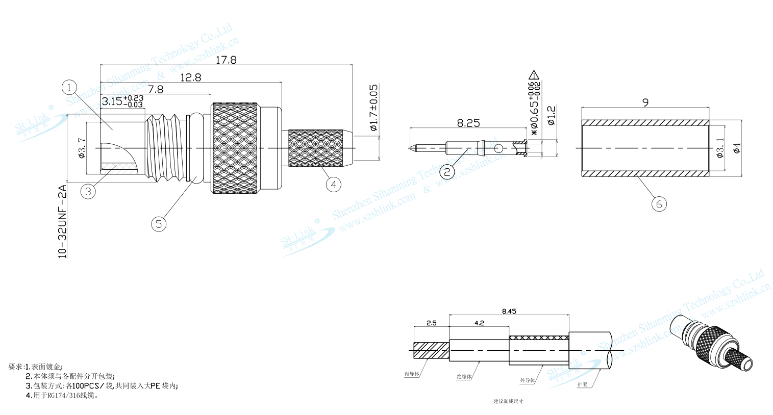 커넥터 재질: 하우징: 금도금 황동; 센터 핀: 금도금 황동; 절연체: PTFE; 구리 튜브: 니켈 도금 황동; 밀봉 링: 실리콘; 백 플러그: 3원 합금 도금 황동