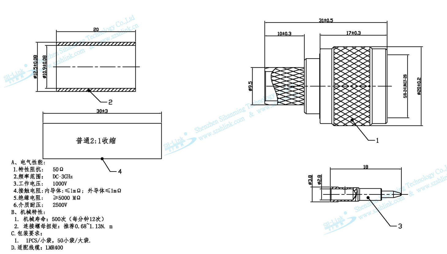 Materials: Center pin: gold-plated brass; Shell: [Missing information]; Insulator: PTFE; Copper tube: nickel-plated brass; Black heat shrink tubing