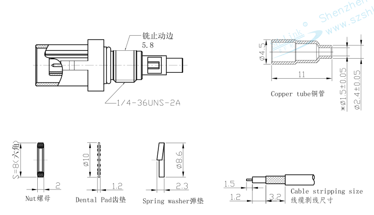 Connector Materials: Shell: Brass ternary alloy; Center pin: Gold-plated brass; Insulator: PTFE; Outer shell: PA66+30%GF; Copper tube: Nickel-plated brass; Sealing ring: Black silicone