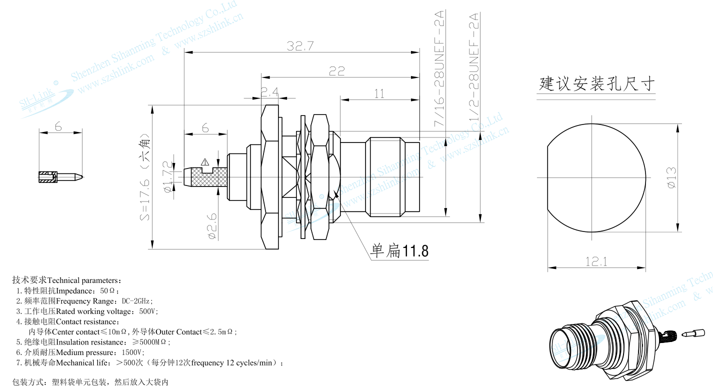ความถี่การทำงานของขั้วต่อ: DC-11GHz; อิมพีแดนซ์: 50 โอห์ม; อุณหภูมิในการทำงาน: -55℃~+125℃