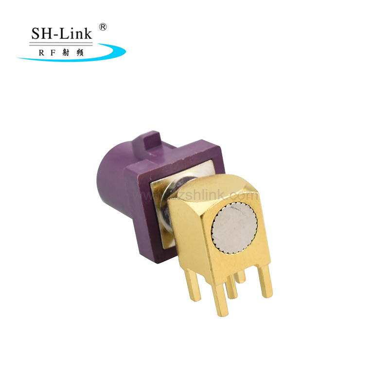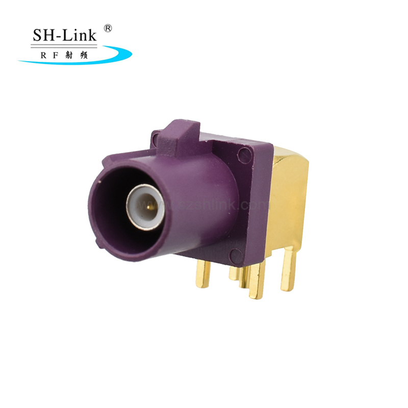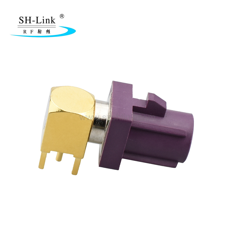 ขั้วต่อ PCB Fakra ตัวผู้แบบมุม (90 องศา) ประเภท D ใช้ในระบบเครื่องเสียงรถยนต์ ระบบนำทาง GPS ระบบเทเลเมติกส์ และระบบอิเล็กทรอนิกส์ในรถยนต์